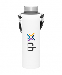 32 oz double wall 18/8 stainless steel thermal bottle with copper vacuum insulation, insulated stainless steel threaded lid, silicone ring, removable strap with buckles, removable clasps, and powder coated finish. Individual gift box. Hand wash recommended. Do not microwave. Complies with FDA, Prop 65. 11" H x 3.1875" W